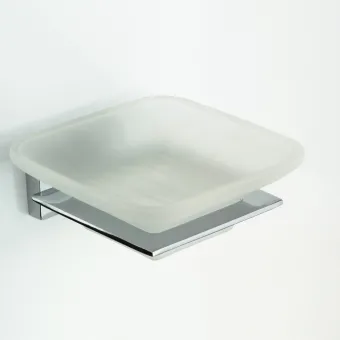 Porte-savon carré mural avec support en acier chromé avec soucoupe en verre opaque, produit à fixer au mur avec des vis. La soucoupe de rechange peut être achetée séparément