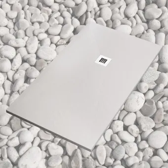 Receveur de douche effet pierre blanche en marbre résine, surface recouverte de gelcoat marin et composé intérieurement de 24% de carbonate de calcium et 76% de résine. Le receveur de douche ne comprend pas de drain. Trou de 90 mm décentré