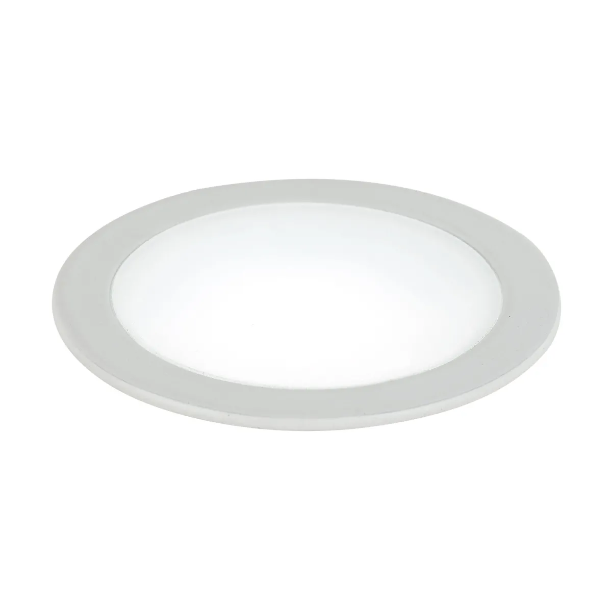 Spot encastré rond, 7 cm de diamètre, en aluminium blanc satiné. Installable en haut plan de travail , dans un...