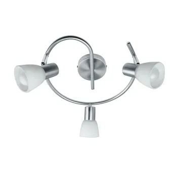 Lustre en chrome, 3 lumières, avec diffuseurs en verre blanc ombré et structure en métal satiné, diamètre 32 cm. Ampoules halogènes de 40 watts chacune, douille E14, non incluses. Plafonnier avec 3 attaques E14 de 40 watts, peut être installé au mur ou au plafond. Mesure en cm HxL 13x32. Ampoules incluses oui / non: Non. Compatible avec les ampoules LED ou halogènes. Couleur: argent.