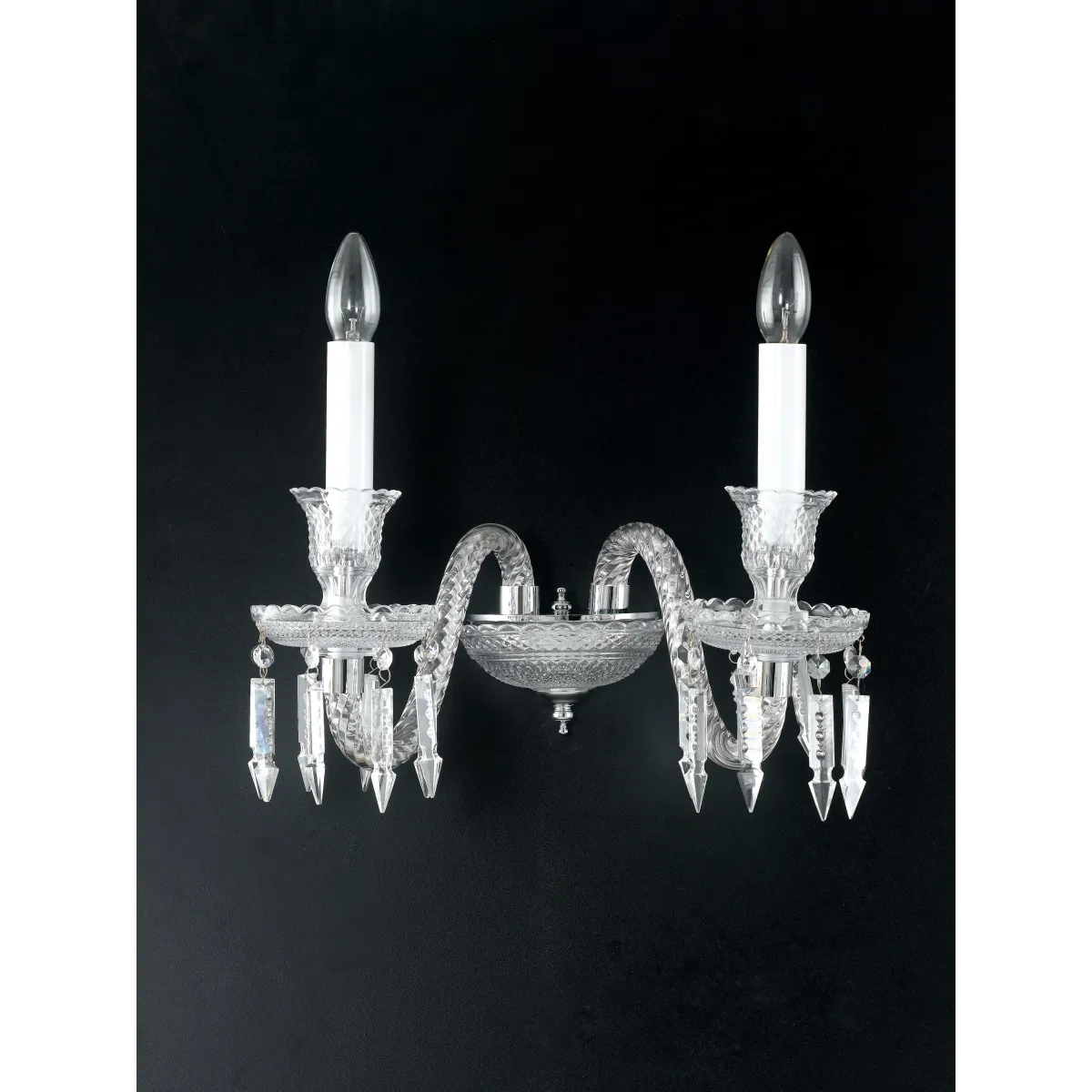 I-LOUVRE/AP2 - Applique con struttura e decori in cristallo, a due luci alogene non incluse, ciascuna da 40 watt, attacco E14. I-LOUVRE/AP2 Applique con 2 attacchi E14 da 40 watt Installabile a Muro. Misura in cm HxL 38x38. Lampadine incluse si/no: No. Compatibile con lampadine led o alogene. Colore: Cristallo. Codice Ean: 8031440352093