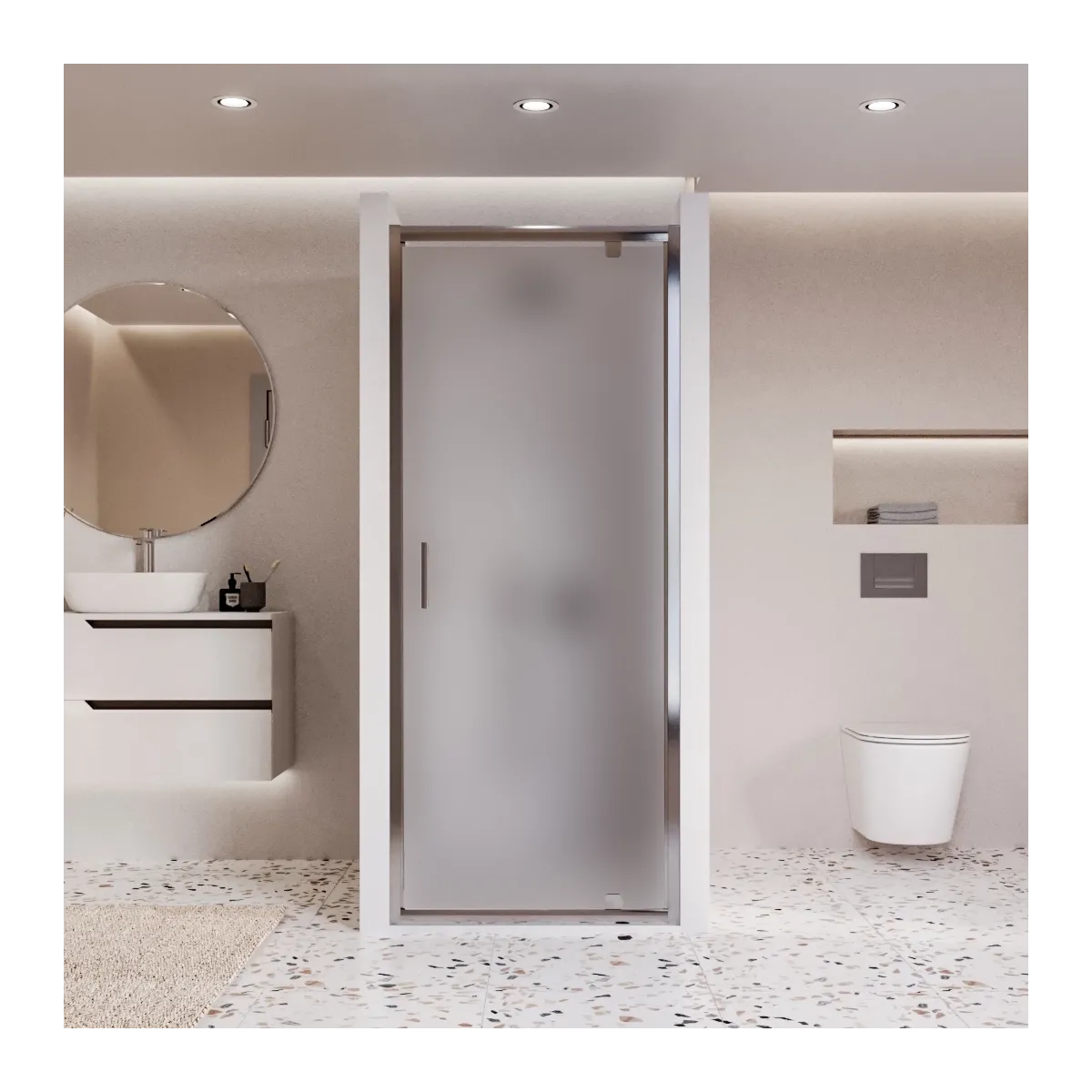 Porta doccia a nicchia battente a bilico, elegante e funzionale. Vetro satinato temperato di sicurezza, spessore 6 mm, altezza 195 cm. Maniglia in acciaio inox e trattamento anticalcare per una pulizia facile e duratura. Design moderno, perfetta per bagni raffinati
