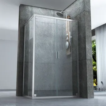 Box doccia a due lati con un lato fisso ed apertura Saloon le porte si muovono sia dentro che fuori, in vetro temperato da 6mm trasparente e telaio in alluminio cromato. Maniglia e profili squadrati cromati. Installabile a filo pavimento o su piatto doccia altezza 190cm