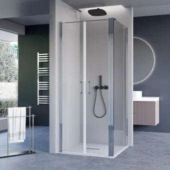 Box doccia angolare con doppia porta saloon in cristallo 6mm temperato con trattamento anticalcare interno. Il modello Dobla 3.0 è dotato di componentistiche di pregio e rifinite nei minimi dettagli. Maniglia in acciaio inox, Meccaniche in ottone cromato, profilo sotto vetro in linea con i cristalli. Braccio di supporto superiore ultra slim
