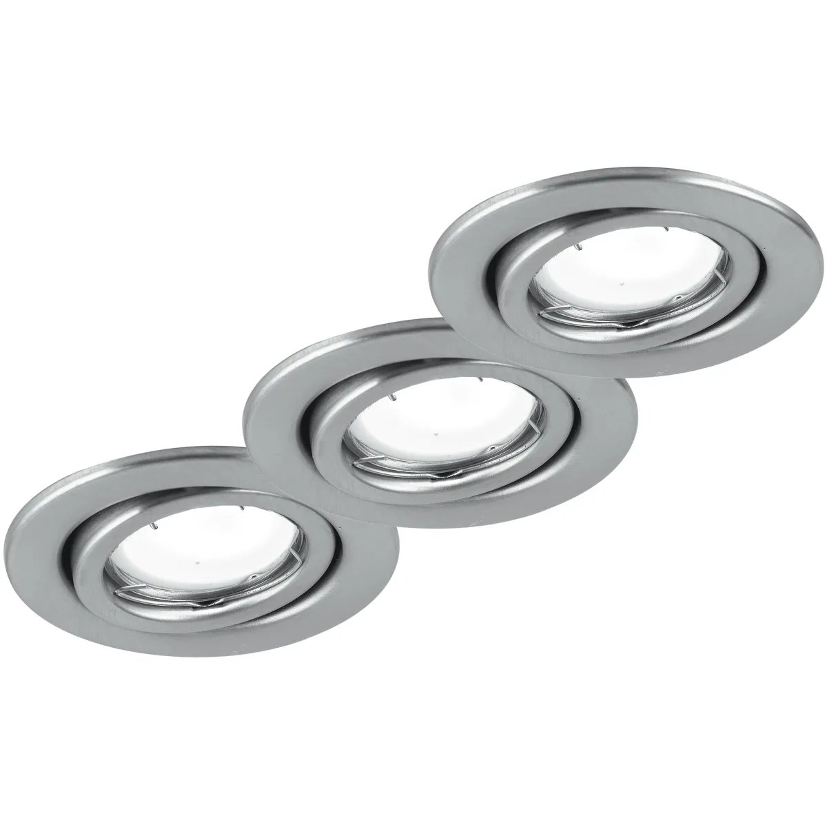 Kit tre faretti a incasso tondi, diametro 10 cm, con struttura in metallo nikel. Ghiera orientabile fino a 15° ....