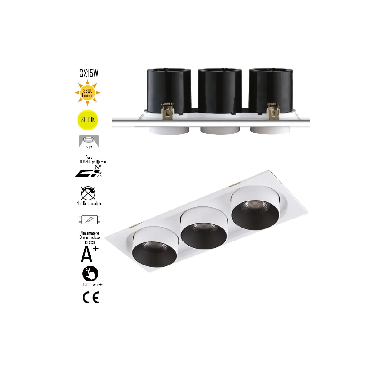 Lampada da incasso orientabile bianco e interno nero LED COB 3000K3x15W