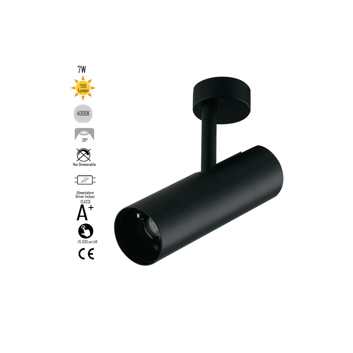 Faretto da soffitto orientabile a led in alluminio nero led cob integrato A+ luce naturale K 7 W
