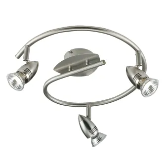 Lampadario circolare, diametro 30 cm, in metallo con finitura color nickel, a 3 luci. Lampadine alogene ciascuna da 42 watt e 2700 kelvin, attacco GU10, incluse