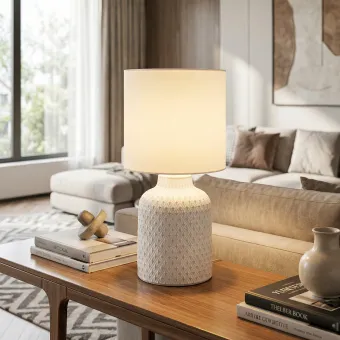 Collezione di lampade da tavolo con struttura in ceramica decorata da piccoli rombi in rilievo. Disponibile nella variante bianca, grigio e rosa antico con paralume in tessuto bianco.