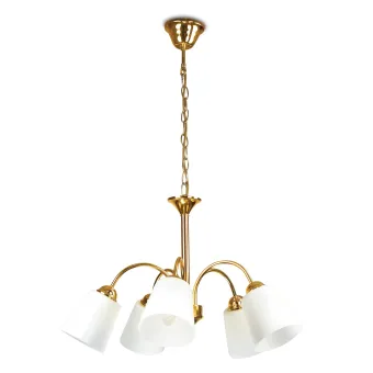 Lampadario con sospensione a catena, altezza regolabile, in metallo oro e diffusori in vetro soffiato bianco. La linea 1162 somma classico e moderno, capace di entrare in armonia con qualsiasi ambiente. 5 luci alogene non incluse da 40 watt, attacco E14. Vedi anche nel colore argento. Scopri tutta la linea 1162, Clicca quà.