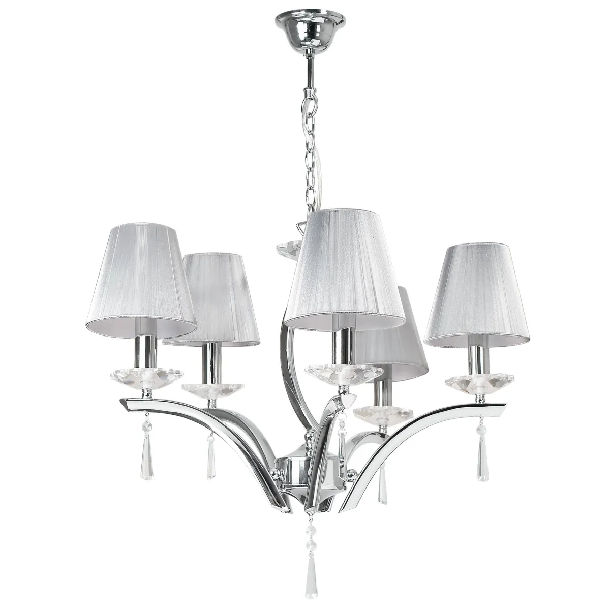 Lampadario sospeso a 5 luci alogene non incluse ciascuna da 40 watt, attacco E14. Struttura in metallo con cristalli K9 e paralumi in tessuto. Disponibile anche nella versione a 8 luci. Lampadario a sospensione con 5 attacchi E14 da 40 watt Installabile a Soffitto. Misura in cm HxL 105x60. Lampadine incluse si/no: No. Compatibile con lampadine led o alogene. Colore: Cromo. Secondo colore: Bianco.