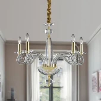 Lampadario sospeso in metalo dorato e cristallo K9, a 5 luci. Lampadine alogene ciascuna da 40 watt, attacco E14, non incluse. Disponibile anche nella versione a 8 luci. Lampadario a sospensione con 5 attacchi E14 da 40 watt Installabile a Soffitto. Misura in cm HxL 120x65. Lampadine incluse si/no: No. Compatibile con lampadine led o alogene. Colore: Trasparente. Secondo colore: Bianco e Oro.