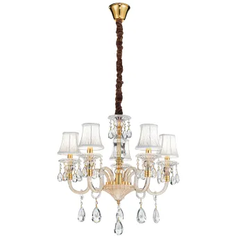 Lampadario a sospensione a 5 luci alogene non incluse ciascuna da 40 watt, attacco E14. Struttura in metallo dorato e vetro con decoro in cristalli K9 e paralumi bianchi. Disponibile anche nella versione a 8 luci. Lampadario a sospensione con 5 attacchi E14 da 40 watt Installabile a Soffitto. Misura in cm HxL 110x65. Lampadine incluse si/no: No. Compatibile con lampadine led o alogene. Colore: Trasparente. Secondo colore: Bianco e Oro.