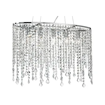 Sospensione ad altezza regolabile in metallo dalla forma ovale impreziosita da pendenti cristalli K9. Lampadario ideale per illuminare salotti, sale d'ingresso e sale da pranzo. la linea è la soluzione per chi ricerca in un arredamento eleganza e lucentezza. Cinque lampadine alogene non incluse da 40 watt, attacco E14.