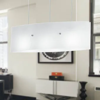 Lampadario a sospensione con diffusore in vetro bianco, a 3 luci. Lampadine alogene E27, ciascuna da 60 watt, non incluse. Lampadario a sospensione con 3 attacchi E27 da 60 watt Installabile a Soffitto. Misura in cm HxL 140x63. Lampadine incluse si/no: No. Compatibile con lampadine led o alogene. Colore: Bianco.