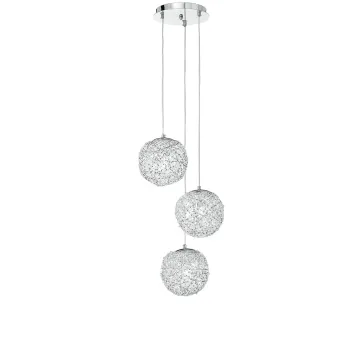 Lampadario con 3 pendenti sferici decorati da un intreccio in fili di alluminio e illuminati da cristalli. Sospensione che proietta preziosi giochi di luce e riflessi creando movimento nell'ambiente. La linea Astra offre prodotti dal design moderno e elegante. 3 lampadine alogene non incluse da 60 watt, attacco E27. Scopri tutta la linea Astra, Clicca quà.