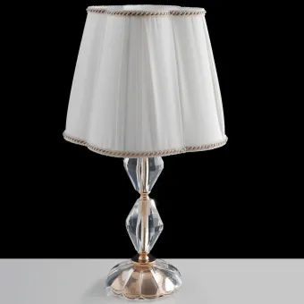 Abat jour in metallo cromato con decoro in cristallo e paralume in tessuto bianco e oro. Lampada da tavolo...