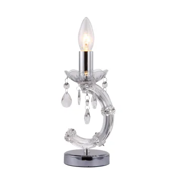 Lumetto con decoro a fiori, pendenti a goccia, finiture cromate e struttura trasparente in acrilico e metallo. Installabile su comodino. Una lampadina alogena non inclusa da 40 watt, attacco E14. Disponibile anche nelle versioni multicolor e ramata. Lumetto Lampada da tavolo Misura in cm HxL 24x9,5. Lampadine incluse si/no: No . Pu portare 1 lampadina E14 da Max 40 watt. Colore: Trasparente.