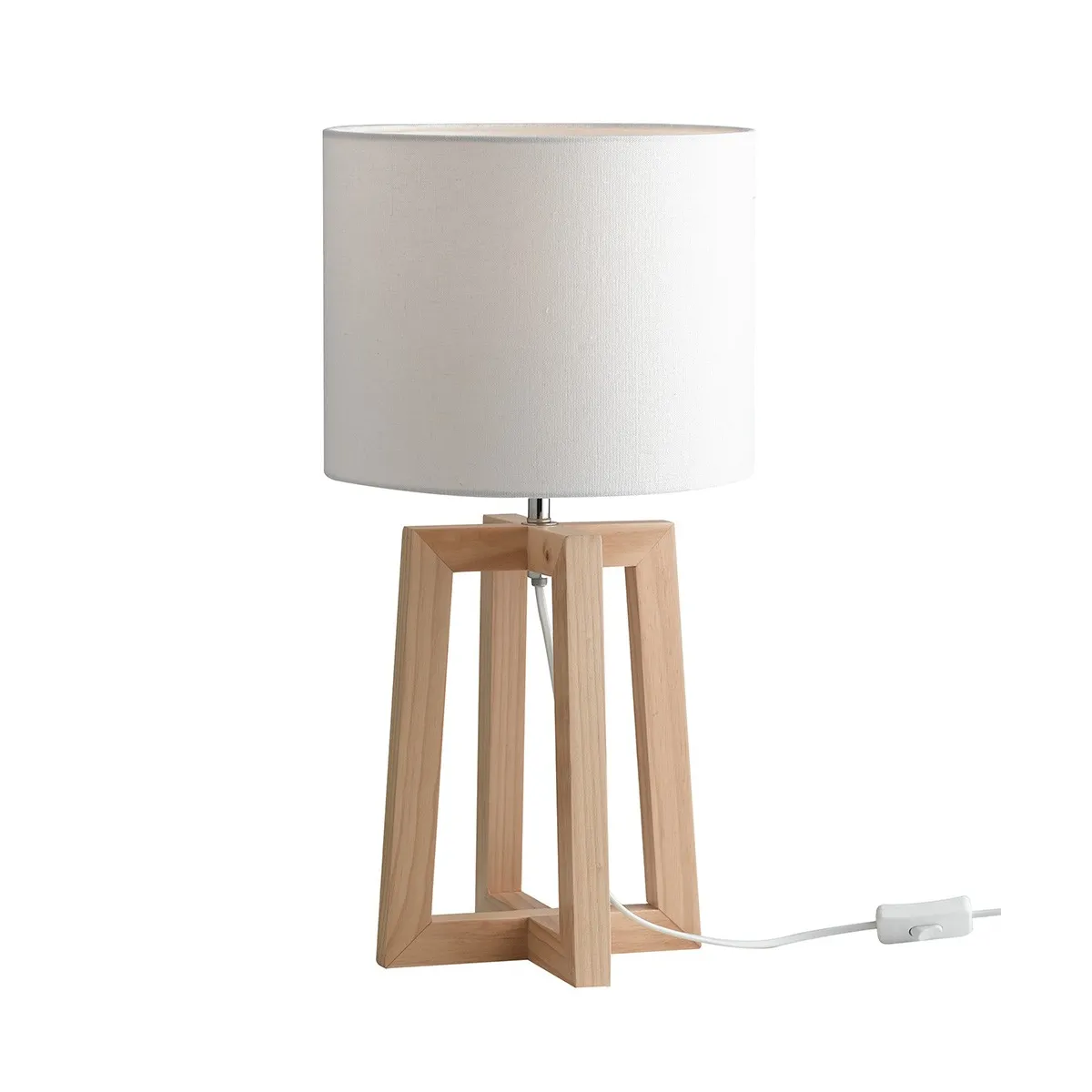 Lampada da tavolo con fusto in legno naturale e paralume circolare in tessuto bianco. Lume dotato di pulsante...