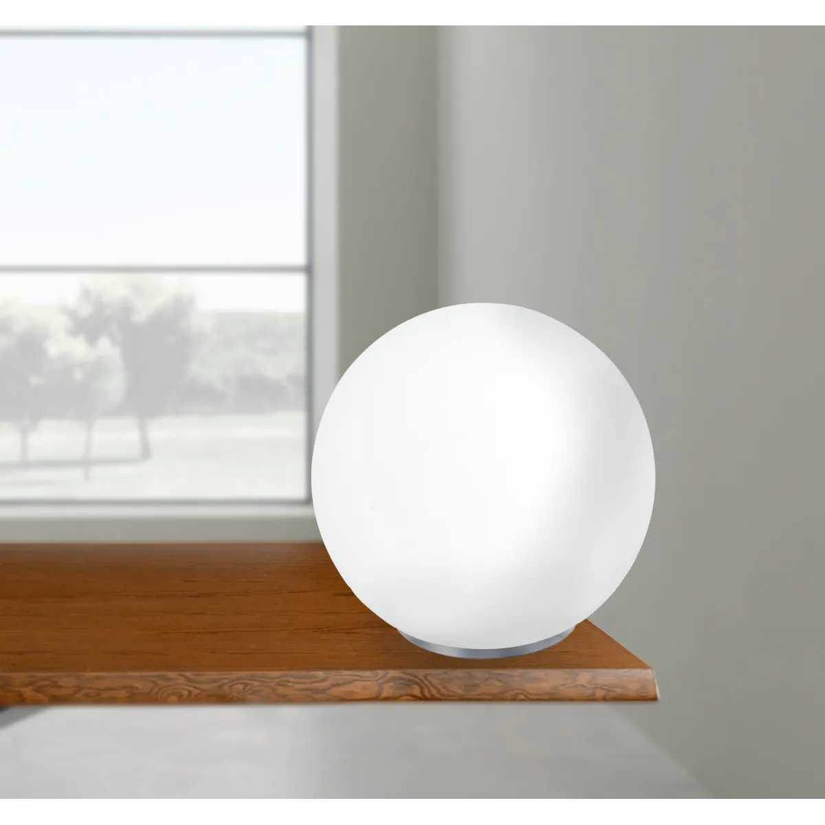 - Struttura moderna sferica in vetro soffiato bianco satinato con base a scomparsa. Diametro 35cm.