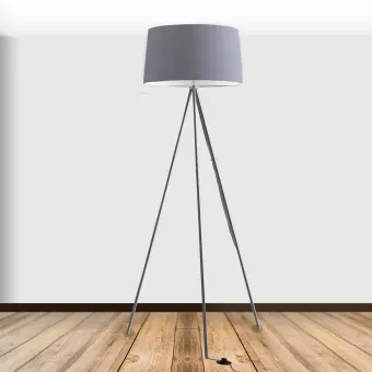 Piantana tre piedi grigia con struttura in metallo e paralume in tessuto. Dotata di pulsante d'accensione...