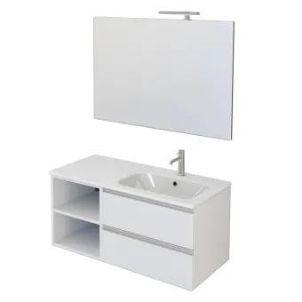 Mobile sospeso con larghezza 100cm di colore bianco opaco che, nonostante le dimensioni contenute, consente di sfruttare al massimo gli spazi disponibili grazie alla presenza dei due cassetti e del ripiano sul lato sinistro del mobile. Ideale per bagni di piccole dimensioni, mantenendo ordine e pulizia senza rinunciare uno stile moderno e minimal. I cassetti sono dotati di maniglia a "C" in metallo con finitura nickel satinato. Il lavabo integrato, dalla finitura lucida, ha la vasca a destra ed è già corredato di foro per il miscelatore e troppo pieno. Lo specchio a filo lucido è applicato su di un solido pannello su cui verrà installata la lampada a led da 25cm