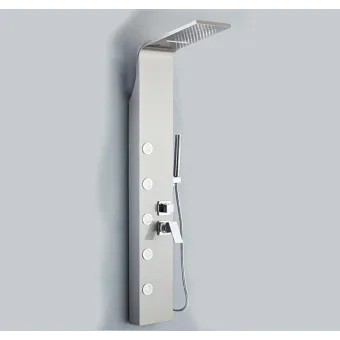 - Colonna doccia idromassaggio Acciaio Spazzolato con getti idromassaggio cromati orientabili. Cascata con bocca in ottone. Supporto doccino in ottone.