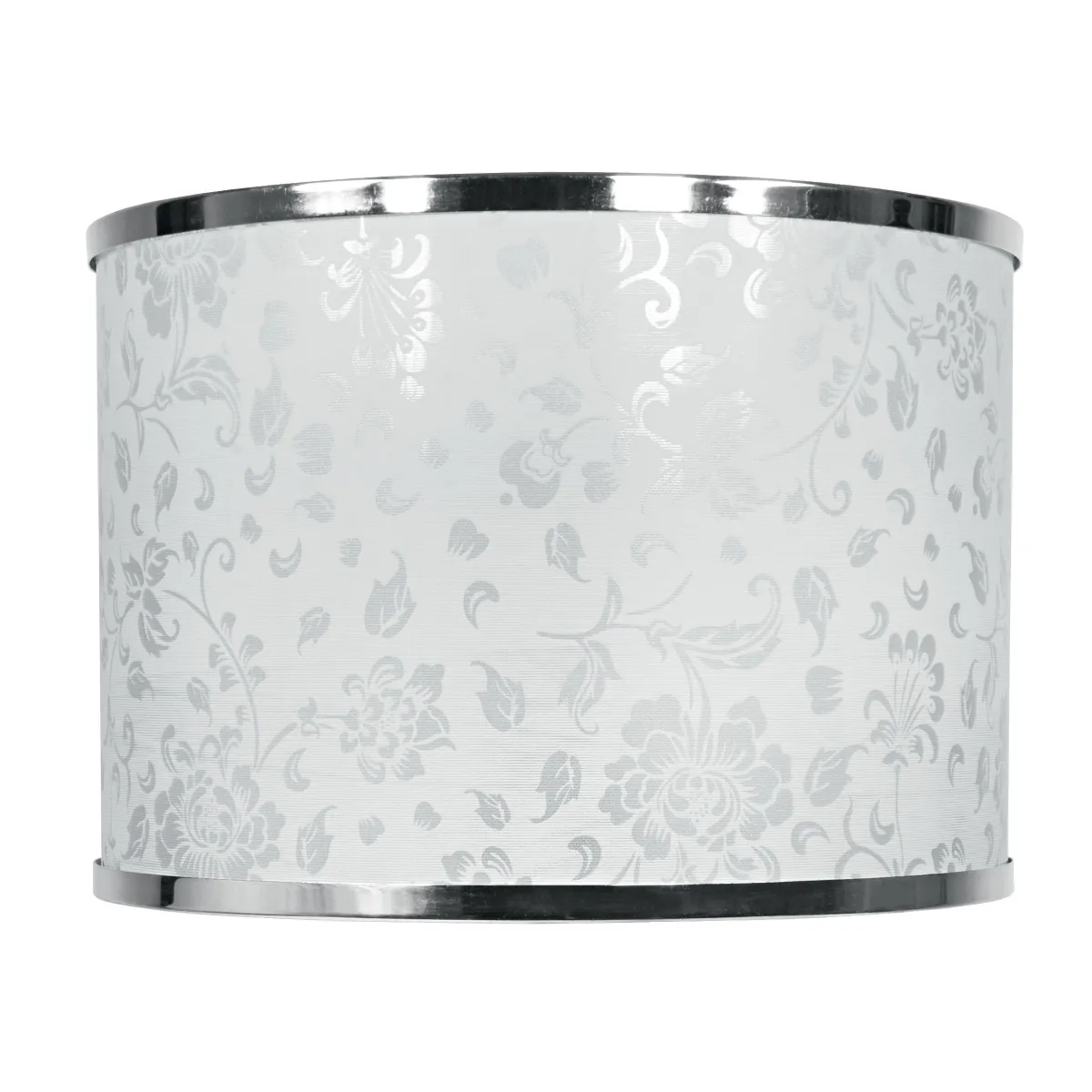Paralume per lampada da tavolo con struttura circolare, diametro 35 cm, in tessuto bianco, decoro floreale e bordi cromati, attacco E27. Disponibile anche con larghezza di 12 cm. Paralume con attacco E27 di Misura in cm HxL 25x35. Colore: Bianco. Secondo colore: Cromo.