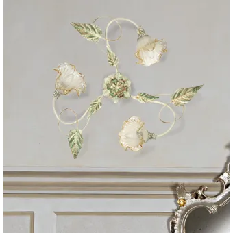 Plafoniera con paralumi in vetro color champagne, foglie eleganti in metallo dipinte a mano verde oro. Lampada da soffitto o parete dalle forme floreali che richiamano alla Primavera. Tre Lampadine alogene E14, non incluse, potenza 40 watt. Disponibile anche nella versione a 5 luci. Scopri tutta la linea Primavera, Clicca quà.