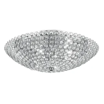 Plafoniera circolare di diametro 20 cm, struttura in metallo con decoro in cristalli K9 tondi. 5 lampadine alogene G9, ciascuna da 28 watt, incluse. Disponibile anche nella versione con 4 luci. Plafoniera Alogena con 5 lampadine G9 da 28 watt Installabile a Muro o soffitto. Misura in cm HxL 15x20. Lampadine incluse si/no: No da 3500 Kelvin. Colore: Cristallo. Secondo colore: Cromo.