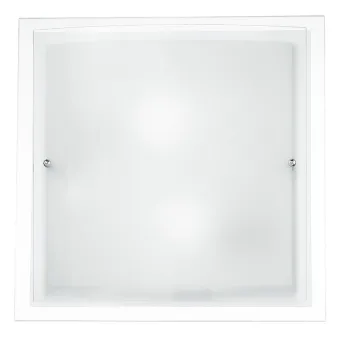 Plafoniera quadrata, 40x40 cm, con doppio diffusore: un vetro curvo bianco opaco e un secondo vetro trasparente....