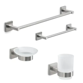 Set da bagno composto da porta saponetta da parete, porta spazzolini, porta asciugamani da 30 e 45 tutto in acciaio spazzolato, prodotto di eccellente versatilità. Infatti può essere incollato a parete con nastro adesivo in dotazione 3M o fissato con viti e tasselli